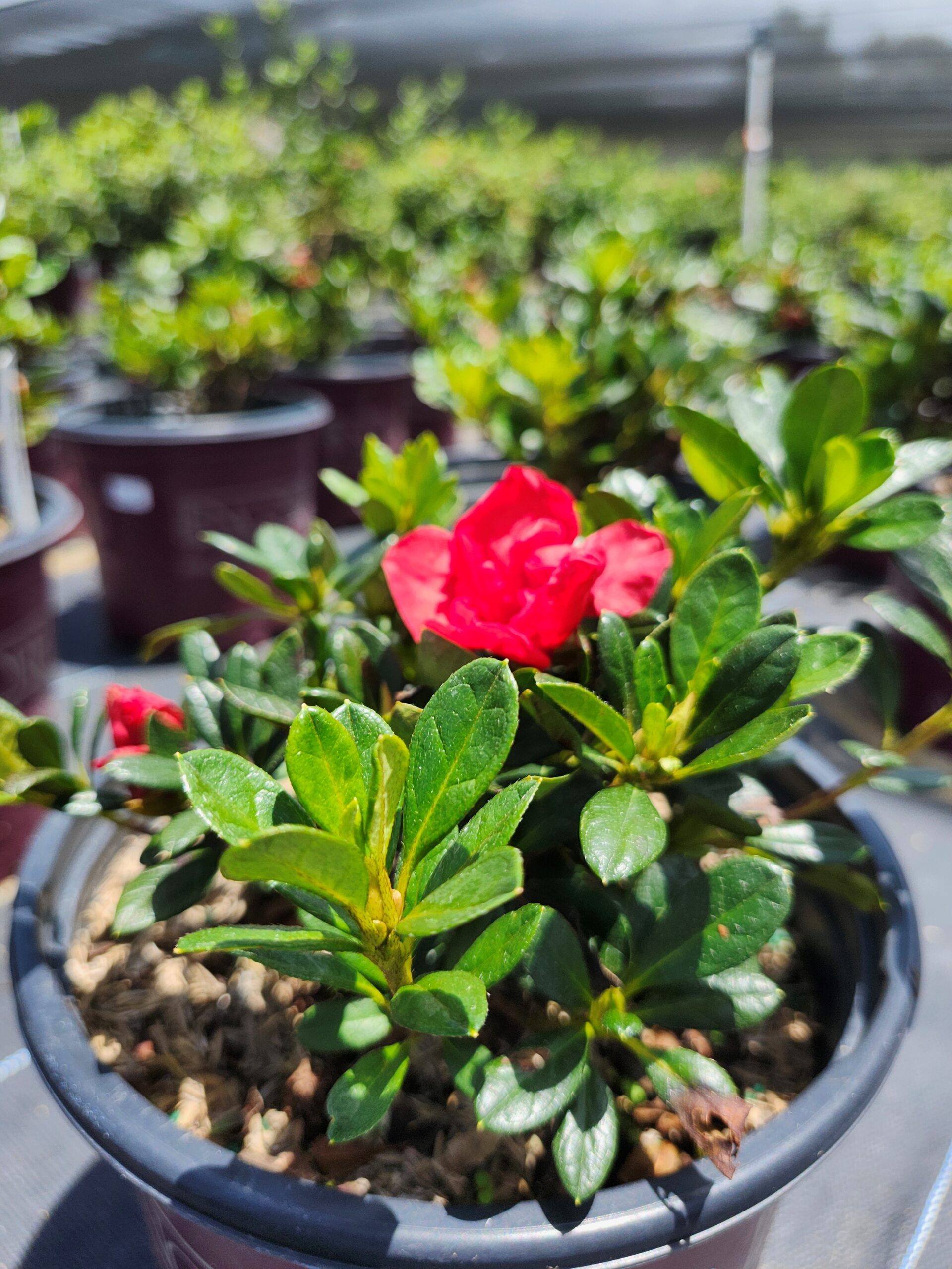 This dwarf azalea flaunts dark green foliage in the summer that turns purple-bronze in the winter. Its gorgeous red, semi-double blooms appear in summer. It grows to be 2-3 feet tall and wide.